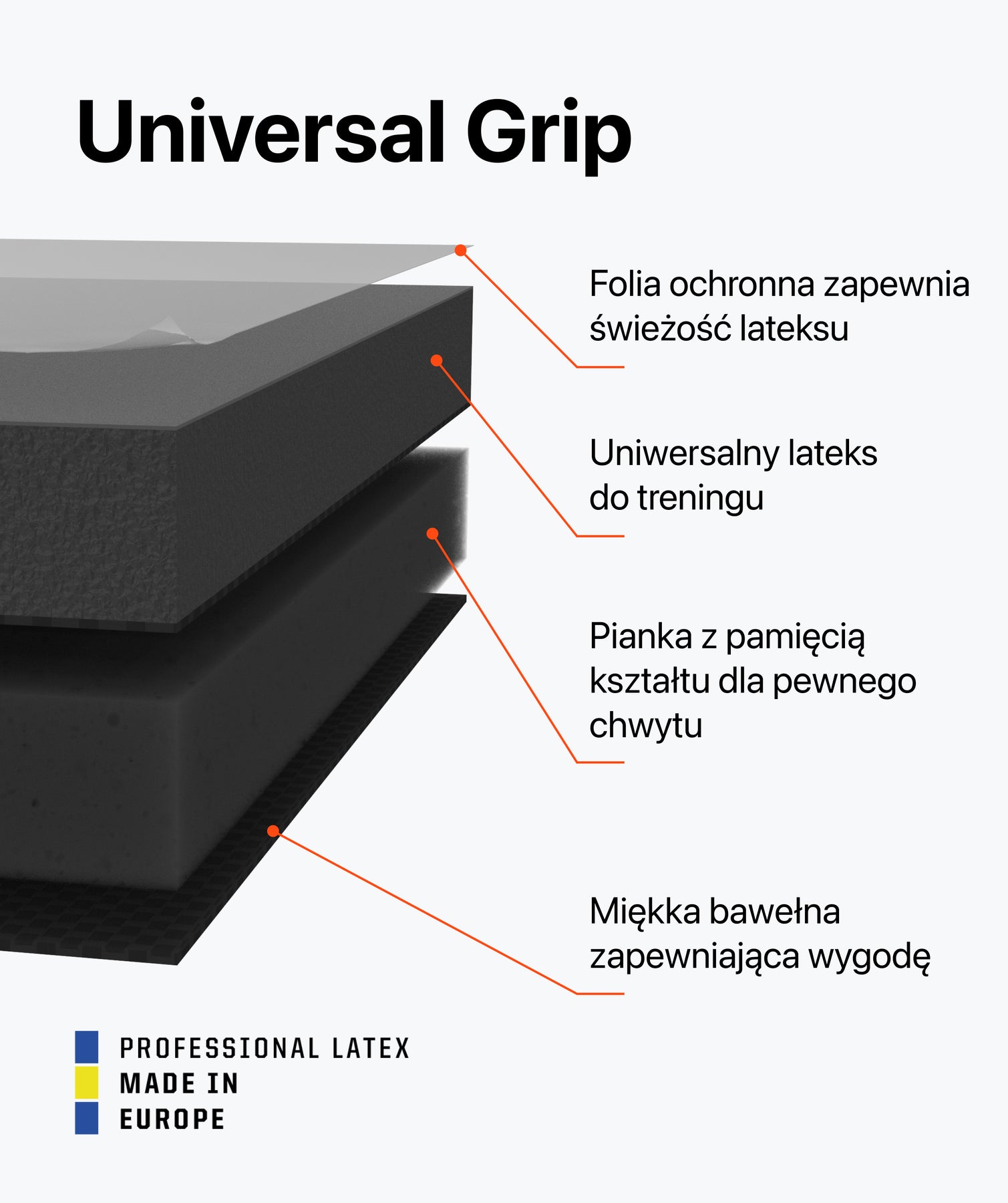 Idealna przyczepność w każdej sytuacji: Wysokowydajna pianka 3 mm + 5 mm Universal Grip zapewnia pewny chwyt i doskonałą kontrolę nad piłką. -