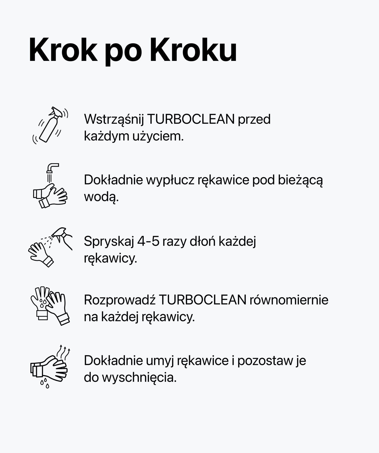 Po treningu w rękawicach wystarczy 3-4 razy spryskać dłonie obu rękawic i mocno wetrzeć pianę przy użyciu niewielkiej ilości wody. Spłukać pod bieżącą wodą, aż nie będzie już pozostałości piany.